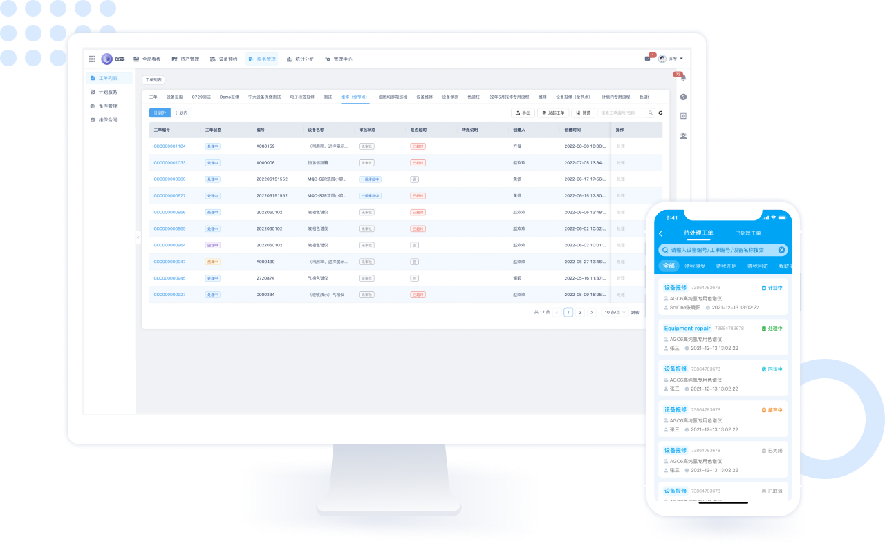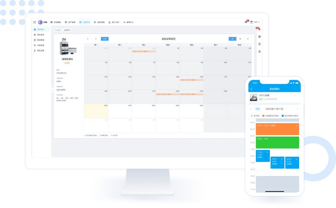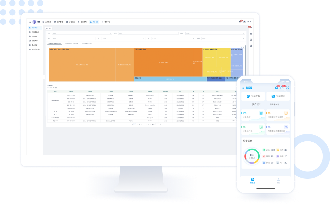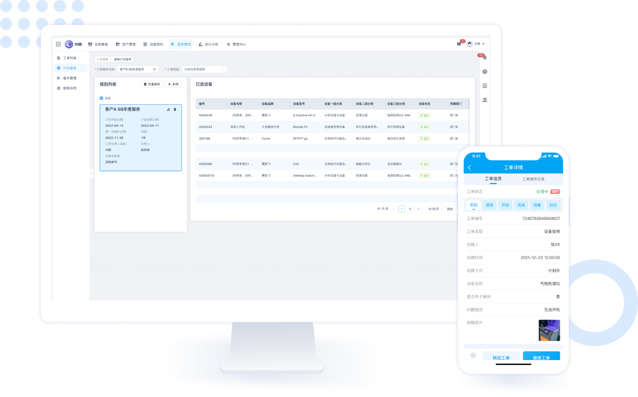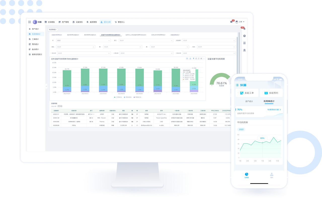 仪器设备管理使用以及仪器设备日常服务三个方面,围绕台账全生命周期管理,从仪器利用率、报修管理、计划服务、仪器预约管理、